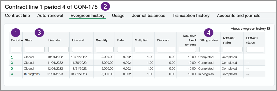 For evergreen contract lines: this tab shows the debit/credit history for the selected recurring billing period.
