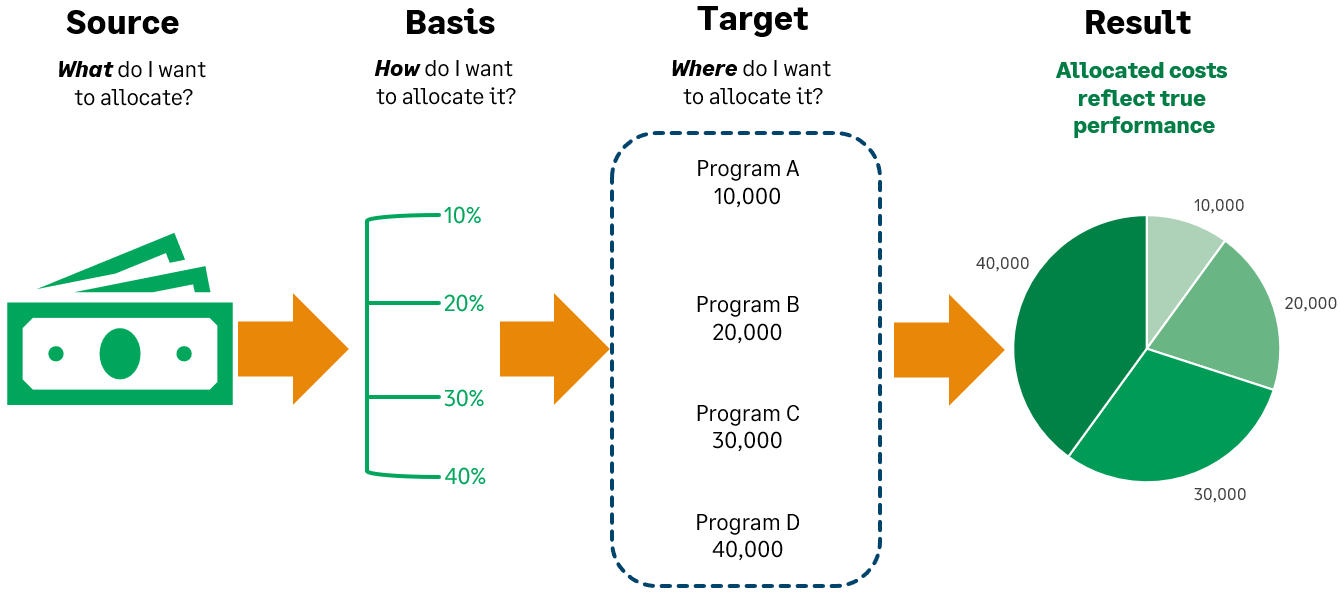For example, suppose you have a dimension called Program, and within that dimension you have 4 programs: A, B, C, and D. If you use a basis (calculation method) that allocates 10% to program A, 20% to program B, 30% to program C, and 40% to program D, a source balance of 100,000 is allocated as follows: