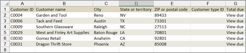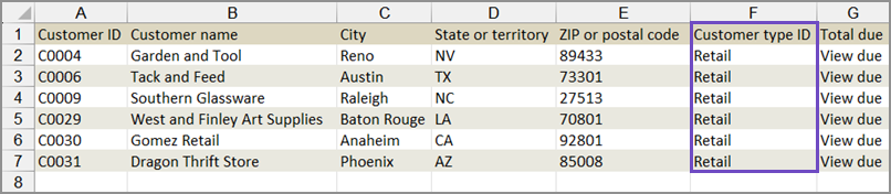 The following is an example of an exported Excel file for Customer records that are missing the Customer type ID.