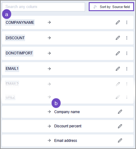 Destination field, which sorts all fields by the destination field first. This displays the list alphabetically, with the destination field (a) followed by the corresponding source field (b).