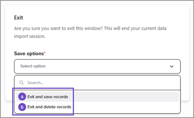 Exit and save records: When selected, the import service keeps changes that you made to the import sheet you were working on. When you open the specific import again, for example, an Add lines import for Statistical accounts, the information from your previous session is available to update or import.