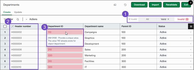When you select a filter, for example the 12 invalid records in the image above, the worksheet displays only the records with errors.