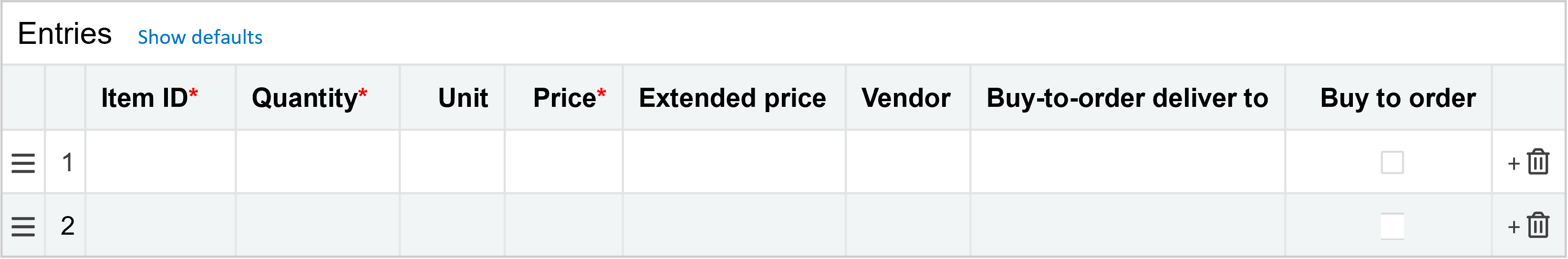 To help your users remember to add a supplier dimension and a Buy-to-order deliver to for a line item that they want to buy to order, you might want to change the Entries section column layout in the applicable sales transactions so that the Supplier dimension and Buy-to-order deliver to field is next to the Buy to order column as in the following example: