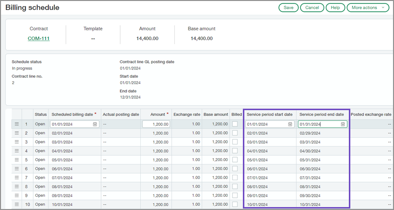 After the contract line is created, you can view the billing schedule to see the service period dates and edit the dates to suit your needs.