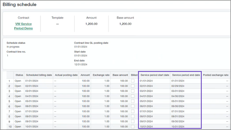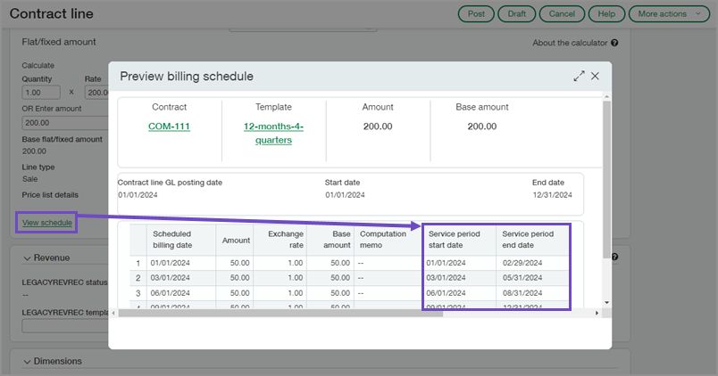 Service period date fields are available on billing schedules. When creating a contract line, you can preview the default service period dates for the billing schedule by selecting View schedule.