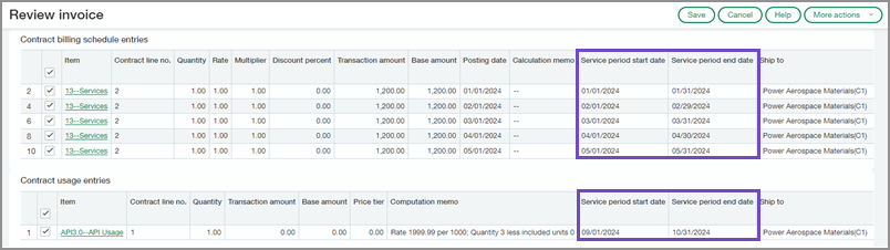 When reviewing an invoice, you can also preview the service period date fields for each contract billing schedule entry and contract usage entry.