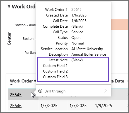 In the Work Orders table, hover over a work order to see key insights for the work order, including the latest note and the three most relevant custom fields.