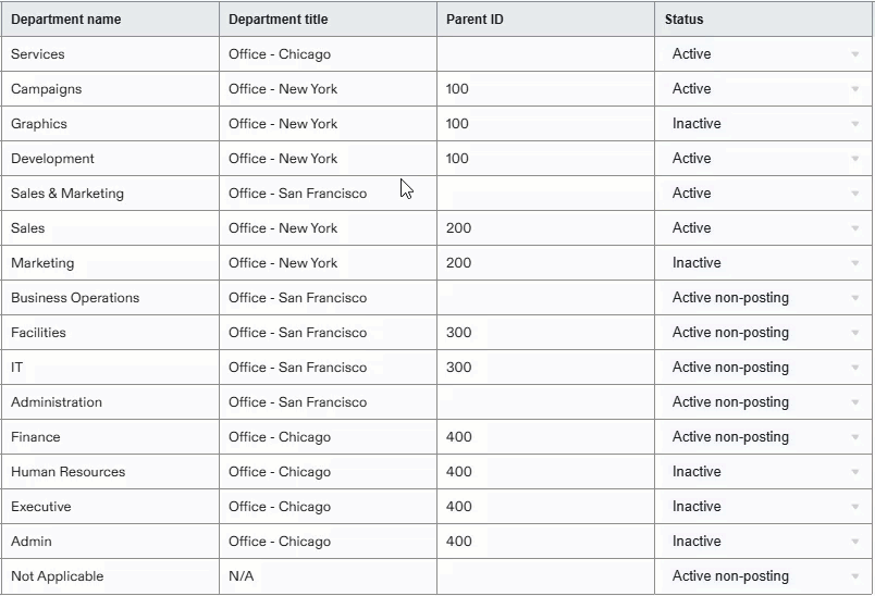 The Status column in this example has only 3 allowed entries: Active, Active non-posting, and Inactive. When you use Replace empty cells in columns with dropdown selections, such as the Status column, you can only select from those available entries.