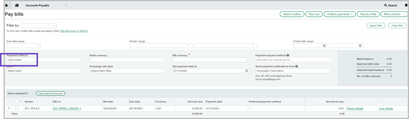 • Only AP bills with joint payees display in the Pay bills list.