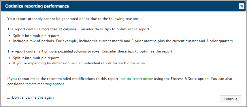The message will contain suggestions on how to optimize the report. If you're running data analysis that goes beyond a simple report, running the report offline can be the best option. Alternately, a different reporting tool might work better, and Intacct will provide links so you can learn more about them.