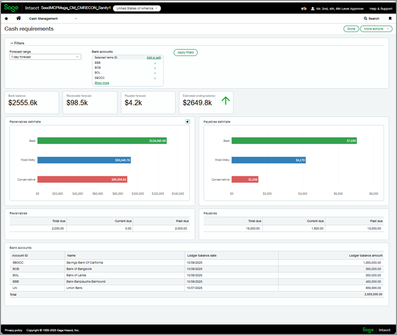 Customize your view: Apply filters for forecast range and select only the bank accounts you want to include for a customized view of your cash flow information.